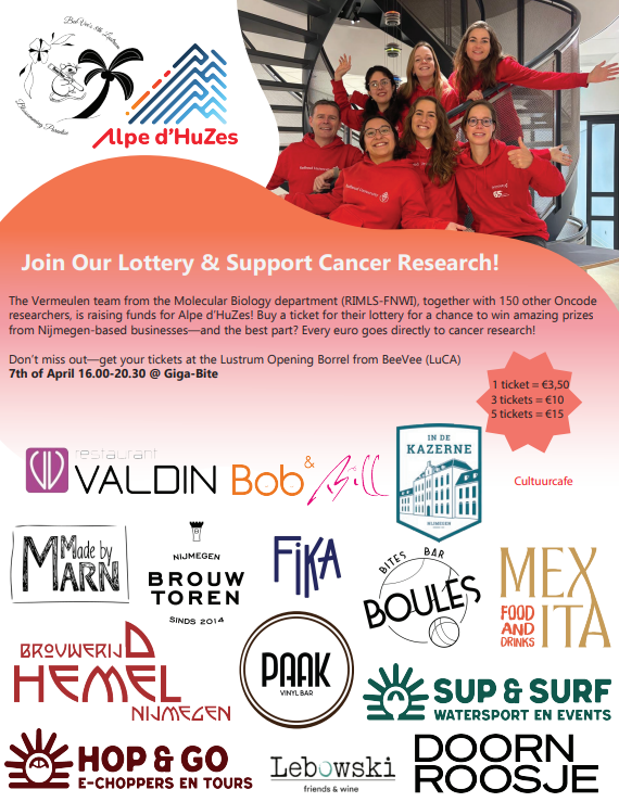 On June 6, a team from Michiel Vermeulen’s lab (Department of Molecular Biology), together with 150 other Oncode researchers, will participate in Alpe d'HuZes to raise money for cancer research. You can support them via this link or by buying raffle tickets for the lottery during the Lustrum Opening Borrel on April 7, with prizes donated by local businesses in Nijmegen!