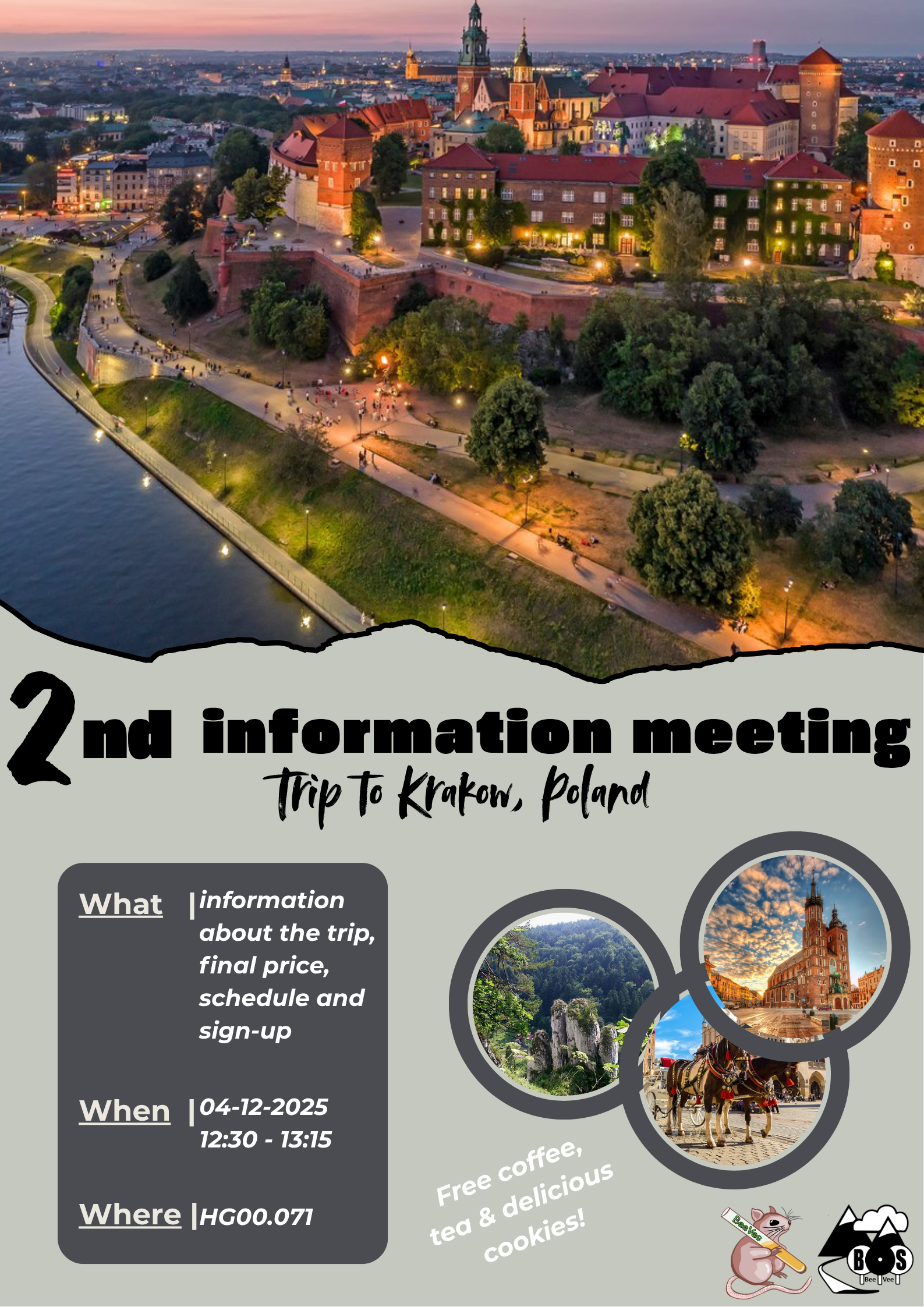 date: 04 December 2025DownloadSave to calendar (ICS). Come to the BOS 2nd information meeting to know more about Krakow! We will share all the details about the final price, the schedule, and how to sign up. There will also be free coffee and cookies!