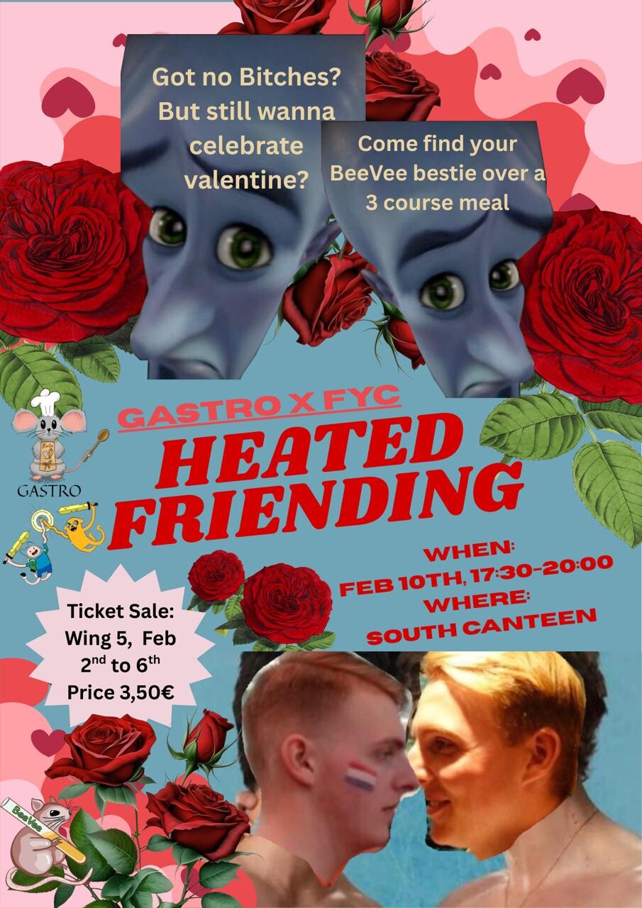 Want to meet some new friends in BeeVee, meet the alternative to speed dating, speed friending! Make new friends while enjoying a three-course meal on February 10th at 17:30 in the south canteen.