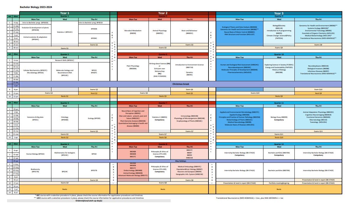 On these pages you can find everything concerning you study and career. This includes of books, exams, contact of the study advisors, but also vacancies and information about biology education in the rest of the Netherlands.